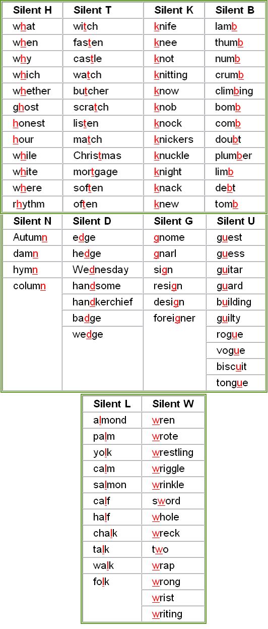 Aşağıdaki liste bazı İngilizce kelimelerin telefuz edilmeyen harflerini göstermektedir.